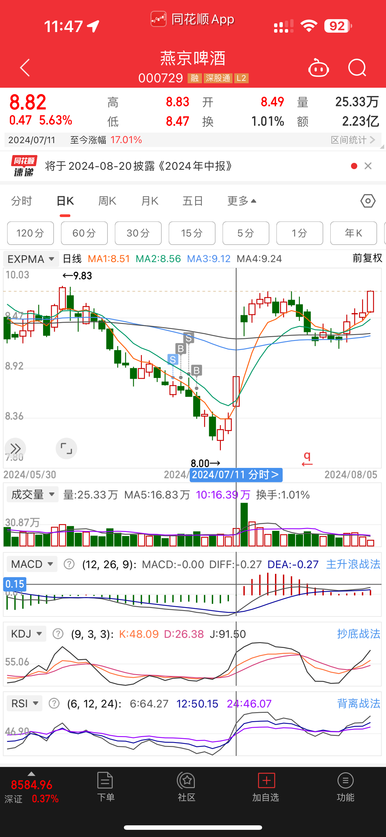也就是在我结束做空的4个交易日后,多空强势反攻,当日上涨5.63%,从这刻起“燕京啤酒”开始了不可逆的多头趋势。从2024年7月11日算,截止到目前2024年8月5日。这只股票已经上涨17.014%。如果是在2024年7月10日买入至今则上涨18.71%。